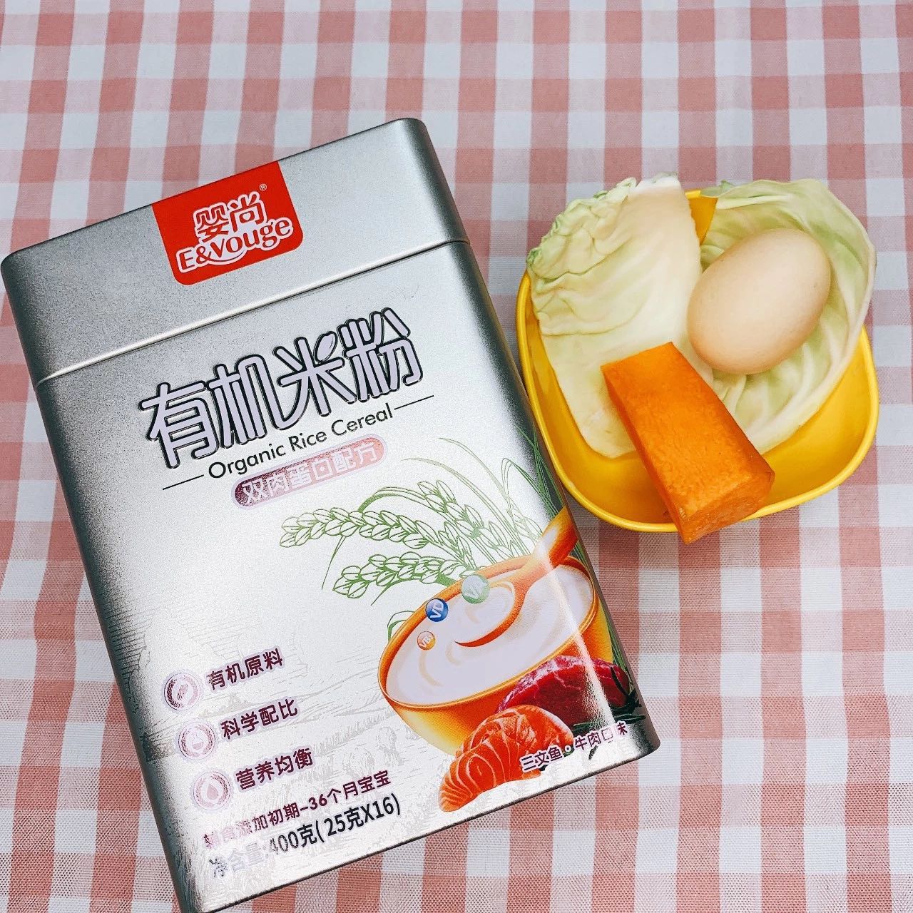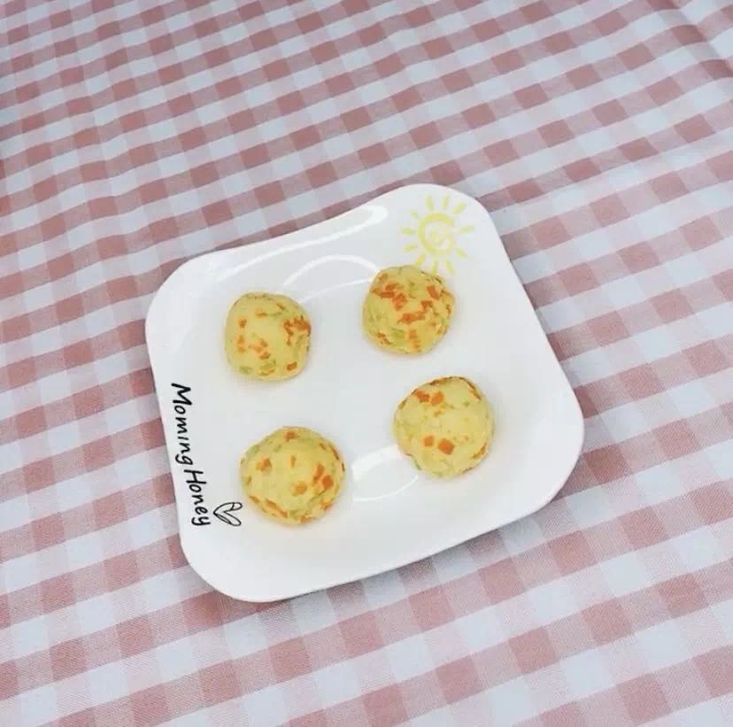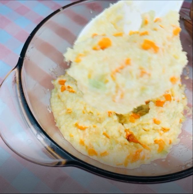 雞蛋攪打均勻,碗內(nèi)倒入包心菜、胡蘿卜和寶寶米粉