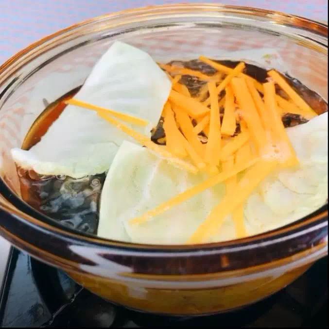 水開后,放入包菜、胡蘿卜絲,焯水3分鐘撈出