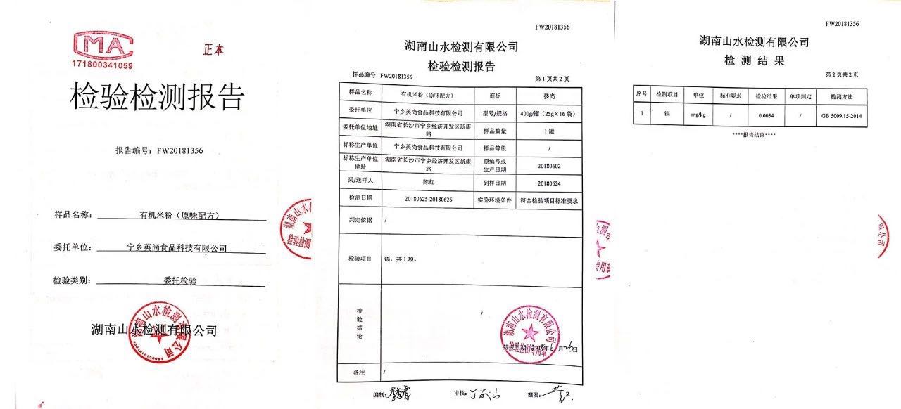 (圖為嬰尚有機(jī)米粉鎘含量檢測(cè)報(bào)告)