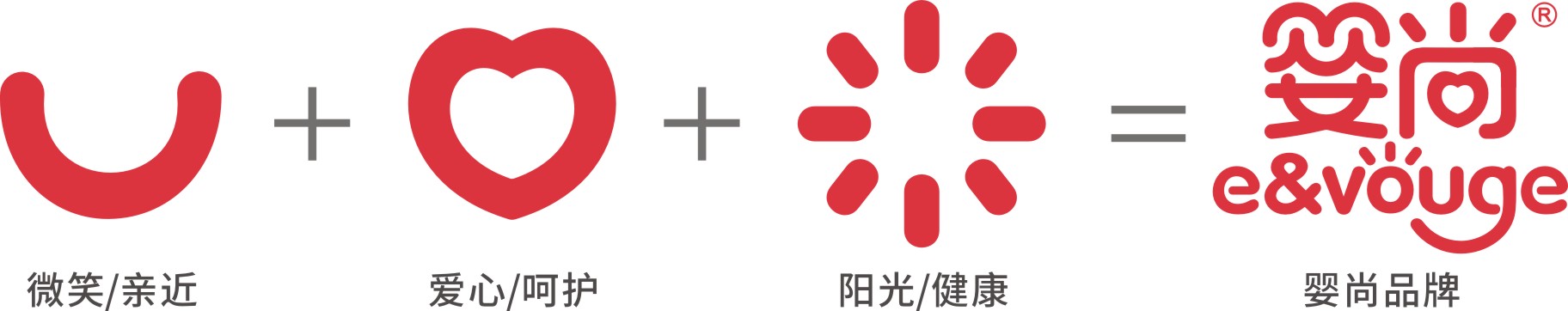 笑臉、愛(ài)心 、太陽(yáng)三個(gè)輔助元素代表了嬰尚要傳遞給消費(fèi)者的三個(gè)價(jià)值觀:陽(yáng)光(活力)、快樂(lè)、愛(ài)(分享)。